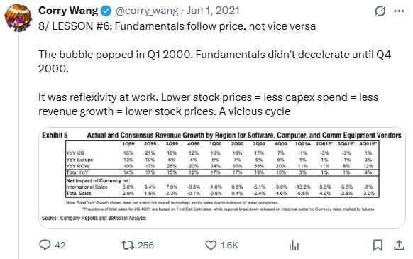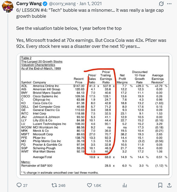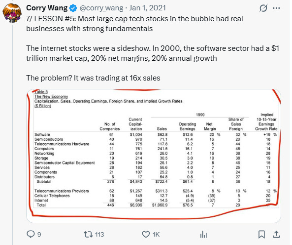 First, I believe some clarifications about the Dot-Com bubble are required, which provide useful context. Corry Wang (@corry_wang on X) had a great thread on this topic back in Jan 2021. This was posted in the throes of the Covid Tech bubble, but is as relevant today. The entire thread is worth reading, but his findings that are most relevant to this post: