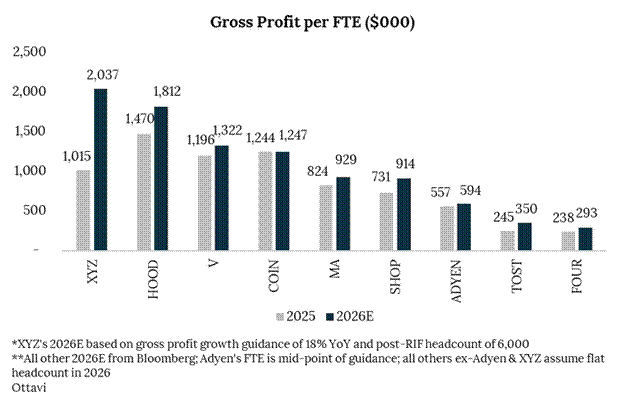 Below is the operating efficiency Dorsey cited by year. Operating efficiency was range-bound from 2019-2022 but is on pace to increase 4.2x since then based on 2026 guidance and double year-over-year. Furthermore, XYZ screens as the most “efficient” fintech in its peer set. I put efficient in quotes, because gross profit per full-time employee is a blunt instrument to gauge operating efficiency. Ultimately, I think XYZ was too bloated and its operating efficiency was insufficient for a business generating over $10 billion in gross profit. It’s also likely seeing some early proof points of efficiency from AI. Lastly, other fintechs are even more bloated, which is likely foreshadowing a focal point for the sector as we move through 2026.