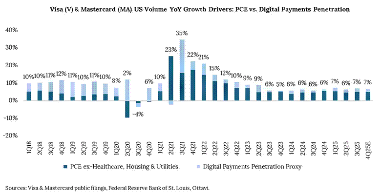 Visa & Mastercard’s US Payment Volume Growth Decomposed: PCE Growth vs. Digital Payments Penetration Gains
