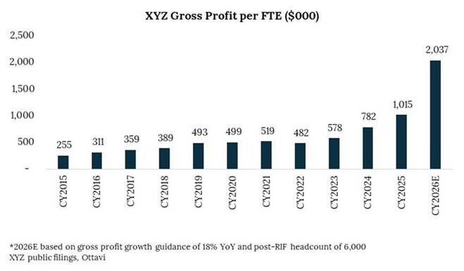 yes we over-hired during covid because i incorrectly built 2 separate company structures (square & cash app) rather than 1, which we corrected mid 2024. but this misses all the complexity we took on through lending, banking, and BNPL. and that we’re now targeting $2M+ gross profit per person, 4x our pre-covid efficiency, which stayed flat at ~$500k from 2019 until 2024. we have and do run an efficient company... better than most.