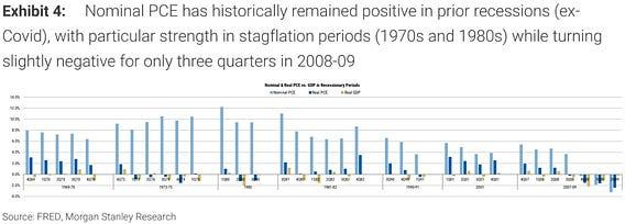 Worth keeping in mind as we enter a more uncertain macro environment: the fundamentals of payments companies tend to be more resilient than investors assume. Payments companies generate most of their revenue from charging a percentage fee on nominal spend, insulating their revenue to some degree from broader macro slowing, especially if nominal and real PCE diverge due to higher inflation. And historically, real PCE tends to hold up relatively well in downturns. Of course, every situation has its nuances and this just focuses on the revenue side of the equation, ignoring the negative impact a downturn would have on valuations. The data below – provided by Morgan Stanley – is meant to illustrate the overall resilience of the payments business model in tough economic times.