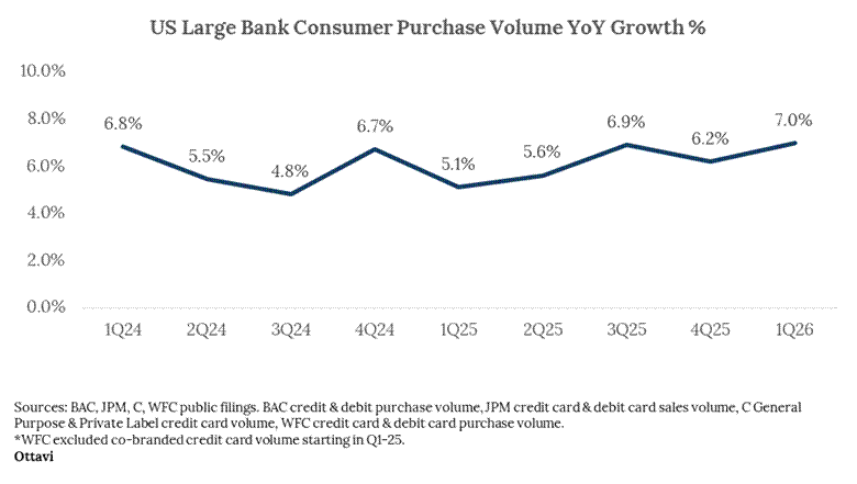 Q1 earnings from the Big Four money center banks landed last week, offering an updated read on consumer spend. Total payment volume growth across JPMorgan, Citigroup, Wells Fargo, and Bank of America was up 7% year-over-year — accelerating 80 basis points from Q4. Consumer spending remains resilient. We’ll get another look at the US consumer when Visa reports on April 28.