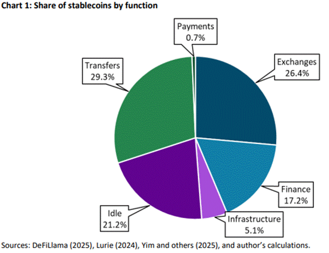 Kansas City Federal Reserve’s Franklin Noll published a report estimating the share of stablecoin volume by function. Much of stablecoin volume is used for trading-related activity and settlement, with only 0.7% of volume related to payments. Noll drew on analysis from Visa, which tracks stablecoin volume — including retail payments — through its Onchain Analytics Dashboard. For all the fervor, stablecoins use for payments remains nascent.
