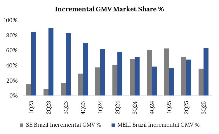 The incremental growth shows why MELI is taking margins down. From 3Q24-2Q25, Shopee’s incremental growth was approximately at par or above MELI’s. While MELI’s overall market share is materially larger than Shopee’s (estimated at ~2x), the incremental growth painted a potentially weaker outlook. However, 3Q25’s incremental growth reverted in MELI’s favor for the first time in 5 quarters, showing that the actions are helping MELI grow incremental share again.