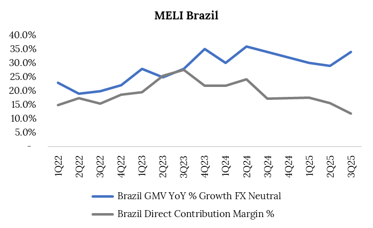 Perhaps the most telling graphic is the ~2-year downward trend for MELI BZ’s contribution margins after peaking at 28% in 3Q23. In 3Q25, MELI Brazil’s margins contracted further to 12%, down more than 370bps quarter-over-quarter, 550bps year-over-year, and nearly 1,600bps since the 3Q23 peak. There are multiple factors at play but it seems clear that MELI is responding to the growing threat from Shopee.