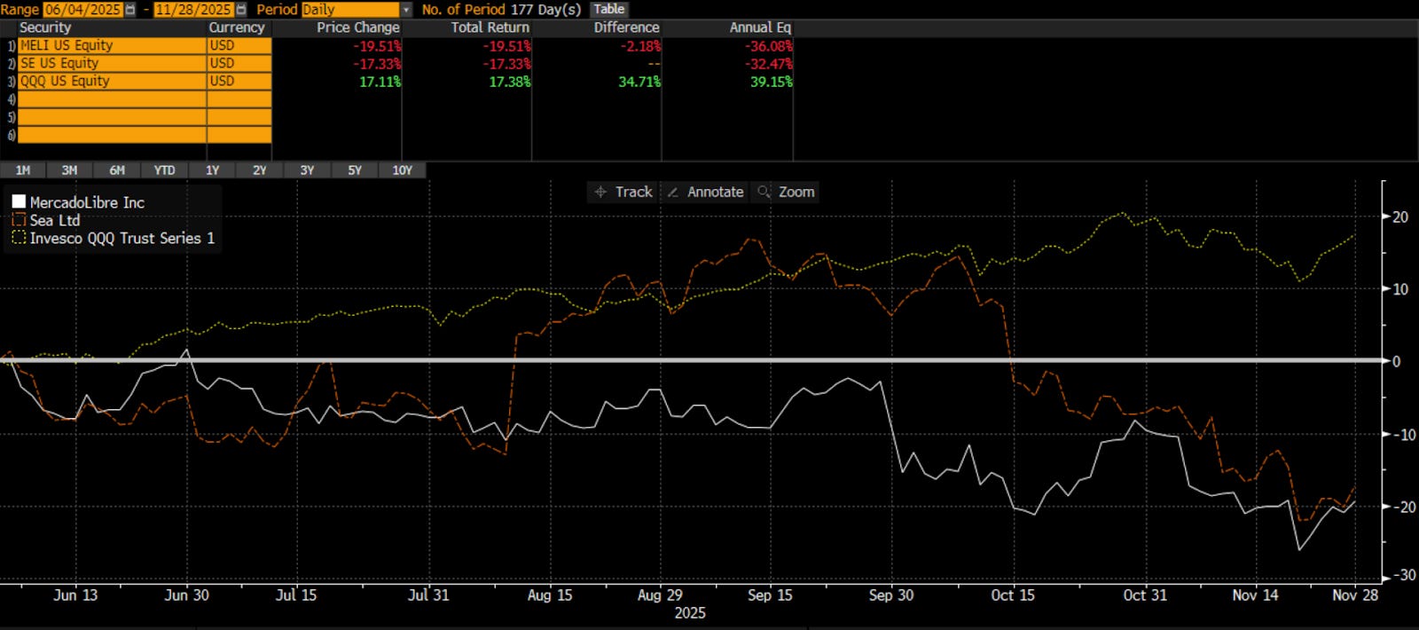 The divergence between the market was more pronounced initially for MELI and has persisted through November, while SE’s underperformance occurred more recently, following revisions to Shopee’s margin estimates. MELI’s reaction was a direct response to SE’s competitive threat in Brazil, while SE’s more recent selloff is partially due to a more competitive Brazil and to investments SE is making in its core Southeast Asia markets.