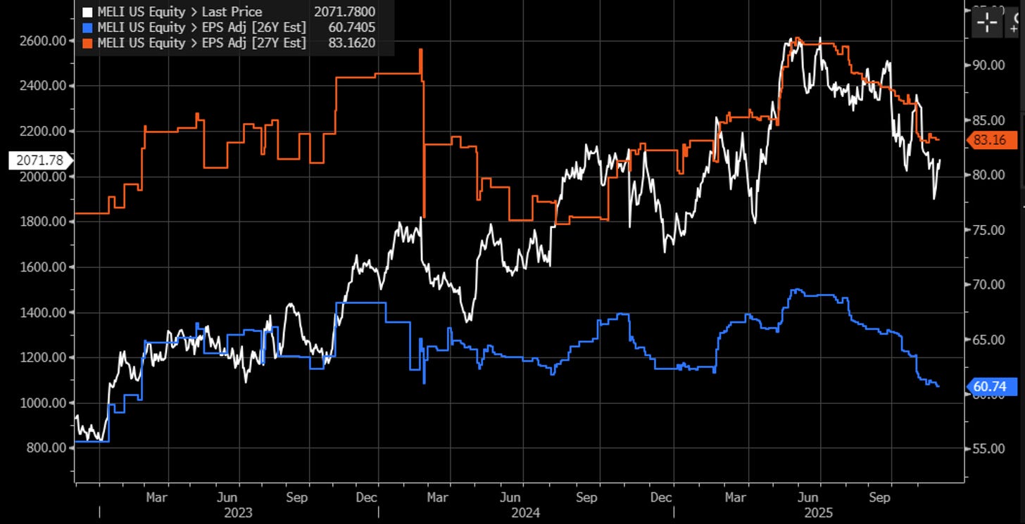 In 2024, Brazil accounted for 46% of MELI’s total contribution profit (before accounting for corporate costs and other overhead). Unsurprisingly, as MELI BZ’s profit estimates got cut, so too did overall estimates. MELI’s 2026/2027 consensus adjusted EPS estimates peaked in early June and have been in a downward trajectory since, coinciding with the free shipping reduction. Since then, MELI’s 2026/2027 adjusted EPS consensus estimates are down ~13% and ~10%, respectively (the graph below overlays MELI’s stock price with changes to 2026/2027 adjusted EPS estimates). Importantly, this is the first time since SE entered the Brazilian market in 2019 that forward-looking estimates have been revised downward due to SE’s risks. When put into this context, it’s unsurprising that MELI’s stock has underperformed over the last several months.