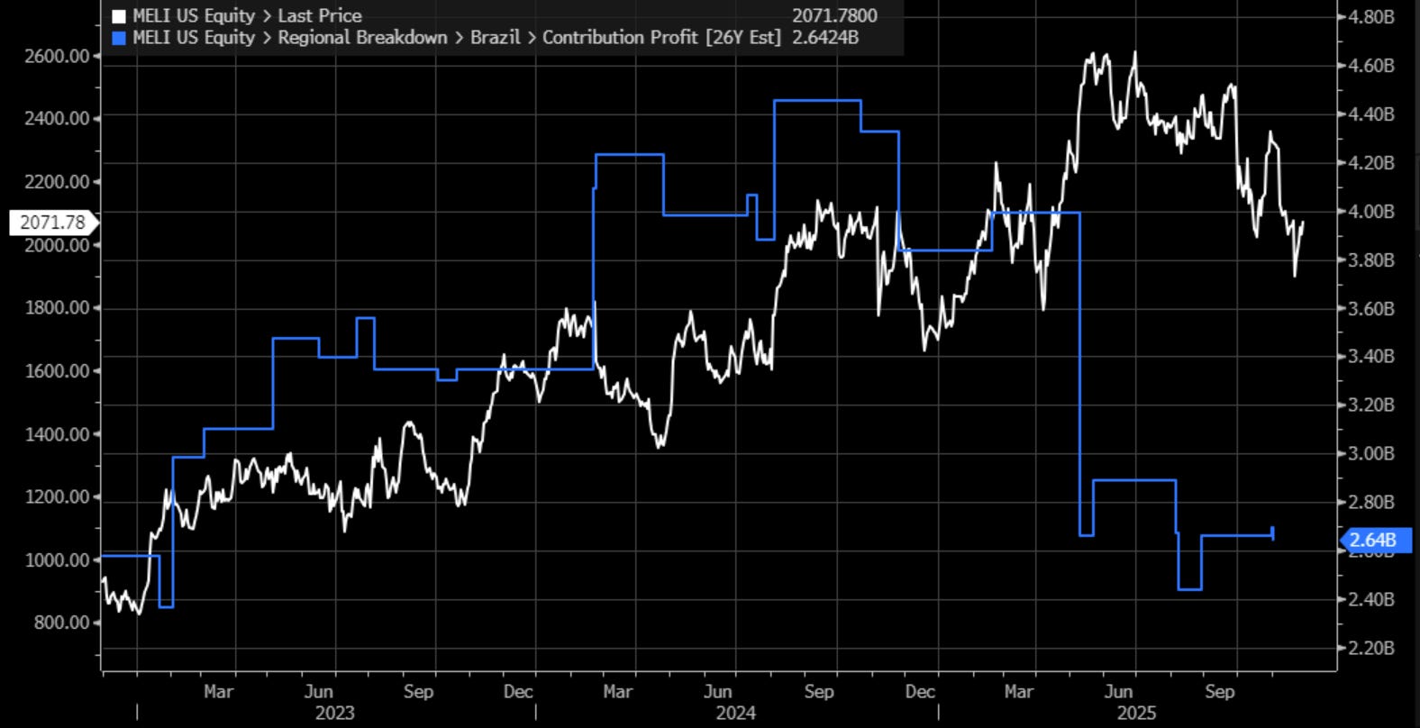 It can be tempting to look at a stock’s underperformance and state that the market is being irrational. However, a stock’s performance needs to be put into the context of how new information has impacted the market’s expectations for future free cash flow generation. Since May, consensus estimates for MELI Brazil’s 2026 contribution profit are down by 34% due to the reduced free shipping thresholds and investments in sales and marketing to drive stronger top-line growth.