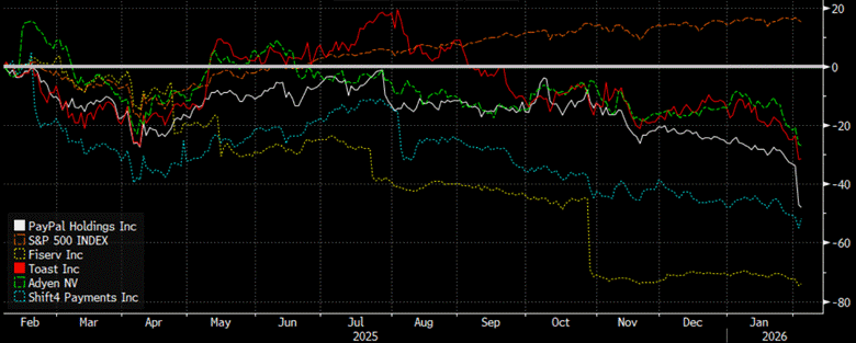 In the midst of the AI-driven software selloff, payments stocks were also hit hard. PayPal’s (PYPL) bad earnings didn’t help matters. This led $PYPL to reset expectations again with CEO Alex Chriss terminated after running the company since September 2023. PYPL’s stock finished down ~20% on the day, while other payments companies were also down double digits. This follows the $FISV -40%+blowup in October after the company announced a materially lower organic growth outlook (among other idiosyncratic factors). This caused further flows out of publicly traded merchant acquirers.