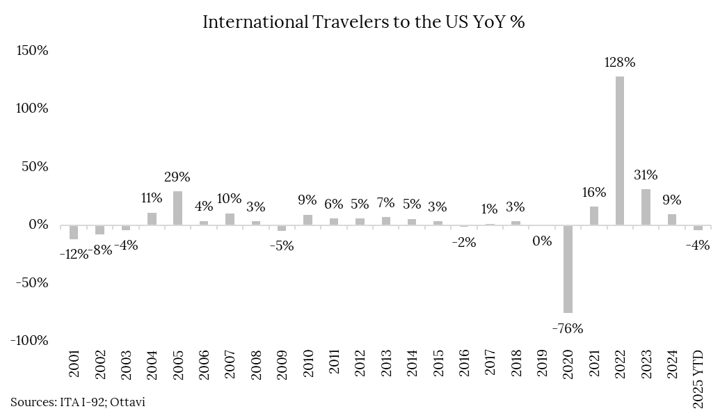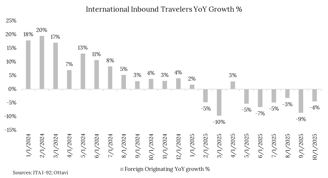 International travel has also weighed on overall demand in 2025, though its impact is smaller given foreign visitors represent only a mid-single-digit share of total trips. Total foreign arrivals are down 4% year over year, driven largely by a sharp pullback from Canadians. Statistics Canada reports that return trips to the U.S. from February to October fell 21% by air and 34% by car. Canadians accounted for roughly a quarter of all foreign visitors to the U.S. in 2024, making them responsible for much of the inbound decline. Notably, foreign travel to the U.S. rarely contracts outside of economic downturns.