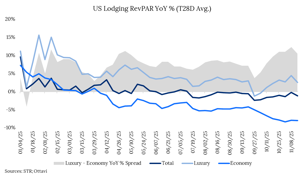 Across the industry, U.S. revenue per available room (RevPAR) has hovered within a narrow –1% to +1% range for much of the year. But performance at the ends of the price spectrum has sharply diverged. Luxury hotels have posted roughly 5% RevPAR growth in 2025, while Economy properties are down about 3%—an 8-point gap. That spread has widened to 11 points more recently as Economy demand has continued to deteriorate. For context, the Luxury–Economy gap averaged just 2 points from 2010 through February 2020. Economy hotels have not generated year-over-year growth since March—33 consecutive weeks of contraction.
