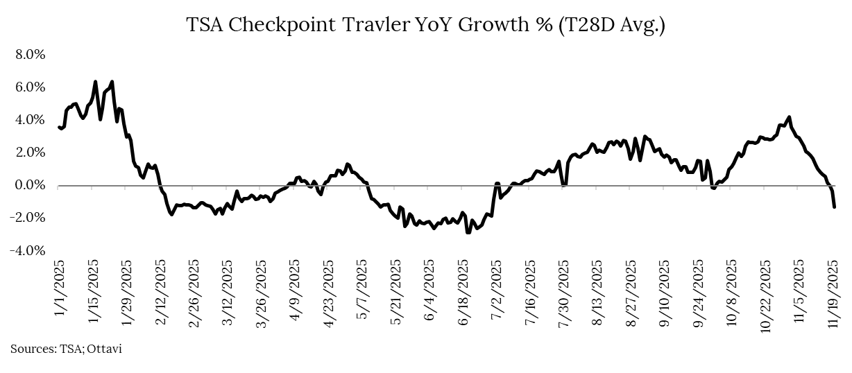 As written in June, travel demand showed signs of softness heading into the summer. It strengthened steadily through July and August and accelerated after Labor Day as the U.S. entered the peak corporate travel season. Recently, this momentum has reversed, with the trailing 28-day average turning negative year-over-year. This dip is likely tied to flight-capacity reductions stemming from the government shutdown rather than a true demand deterioration. If that’s the case, TSA throughput should rebound in the coming weeks as the holiday travel season ramps up.