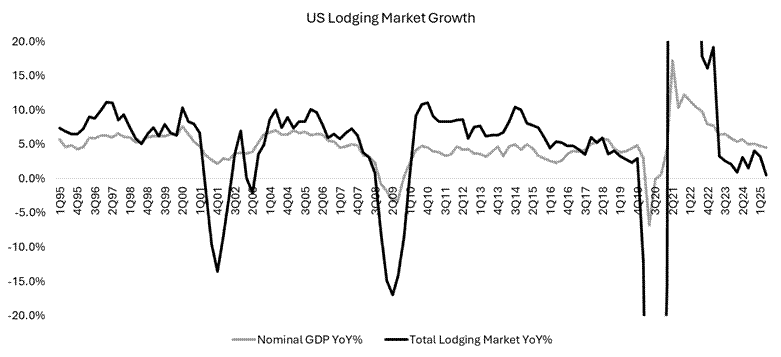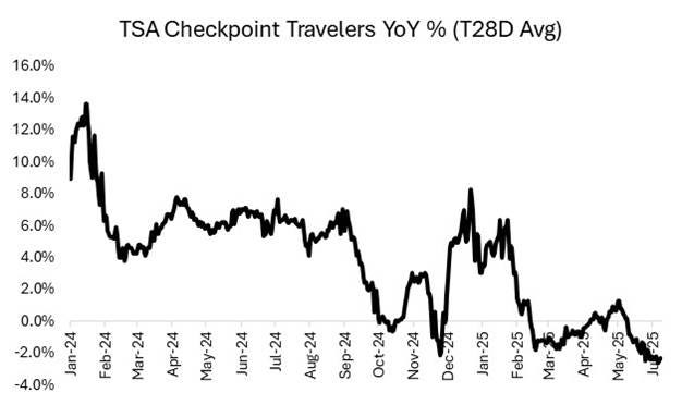 Hotel data is also unsurprisingly weak. Revenue per available room – or “RevPAR” – which calculates the amount of revenue a hotel generates each night, is down 2.5% for the first two “unofficial” weeks of summer, starting with Memorial Day and has been flat year-over-year since April. Like air travel, the US hotel industry typically grows absent economic contractions, usually in line with or better than nominal GDP. Lodging has trailed nominal GDP since early 2023, with growth diverging more in Q2 (my Q2 estimates assume the last 3 weeks of the quarter resemble the current trends over the past month).