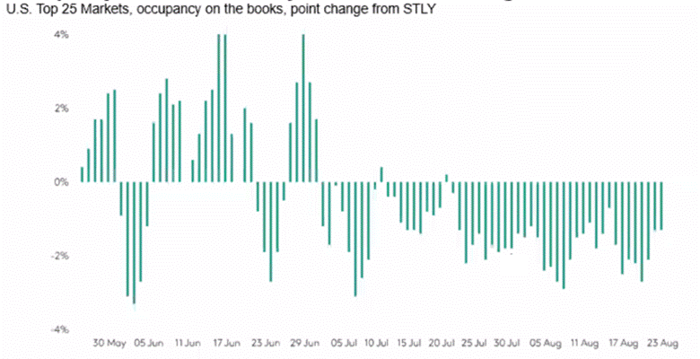 Trends started to weaken leading up to Liberation Day, with Delta pointing to softening trends in mid-March. Then there was a more protracted pause post-Liberation Day. Most travel companies have called out stabilizing-to-improving trends since April 2nd, which was reflected in the data – helped by the Easter calendar shift. What is more surprising is that this recovery hasn’t sustained, with data worsening over the last 2-4 weeks and at least some forward-looking data inform us that this may continue into the summer. STR (owned by CoStar), which tracks data for 87k+ hotels globally – and most of the hotels in the US – shows room nights on the books for July and August down in the low single digits year-over-year. The graph below is occupancy on the books for future dates as of the end of May. The data can be volatile from week to week, but July and August consistently show a negative trend.