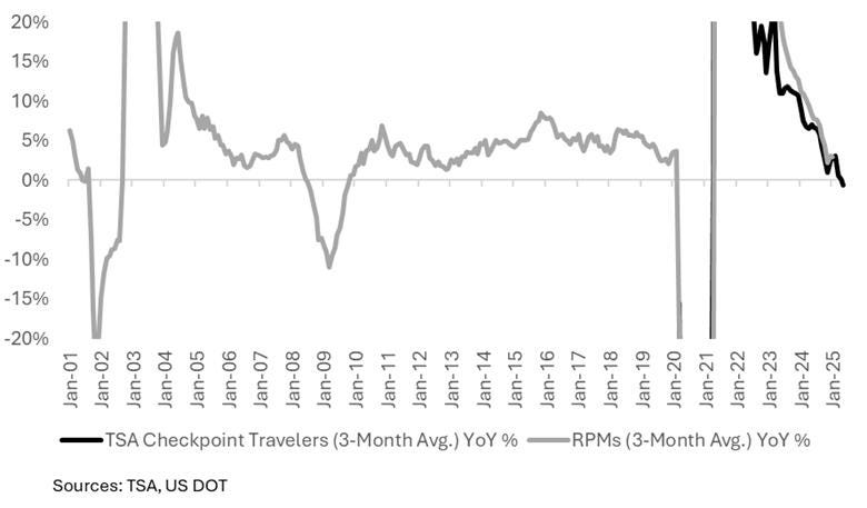 Similar to international travel, domestic travel demand typically grows absent economic contraction. Revenue passenger miles (RPMs) – a proxy for air travel demand – have only gone negative three times in the past 25 years (9/11 / dotcom bubble, GFC, and Covid). Unlike the TSA data which only dates back to 2020, RPM data can be analyzed over decades. The TSA and RPM data are correlated, and can be used relatively interchangeably as an air travel demand proxy. The TSA data informs us that RPMs growth likely went negative in May, with continued declines so far in June.