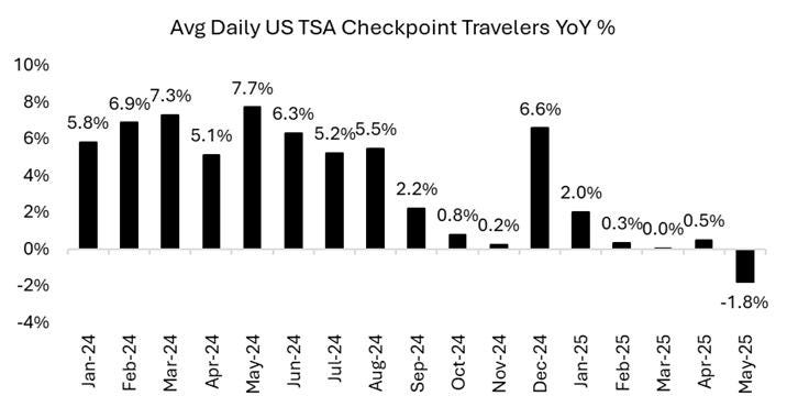 In normal times, international travel provides a tailwind to total US travel, especially in the summer months when travel over-indexes to leisure, but it still only accounts for a mid-single-digit percentage of total trips in the US annually. A 50bps impact to US travel demand (assuming 5% of total trips and the current -10% YoY trends hold throughout the summer) would generally be offset by domestic travel growth. However, domestic travel is also showing weakness. Average daily US travelers going through TSA checkpoints – a proxy for travel demand – were down 1.8% in May – after ranging from 0-2% in four prior months to start the year. If we assume international accounted for 5% of total demand, then the domestic growth was also negative in May.