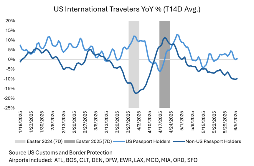 The WSJ recently published an article citing that foreign arrivals at the US’s main airports were down 6% YoY (as of the end of May). These figures included the tail-end of tailwinds from Easter occurring later this year versus 2024. Since Easter, international arrivals have worsened. Non-US passport holders entering 12 of the country’s largest airports is -10% on a trailing 14-day rolling average, with the trailing 7-day average at -13% (as of June 6). For May, non-US passport holders entering 12 of the country’s largest airports were down 6.6% year-over-year, in line with the WSJ figure.