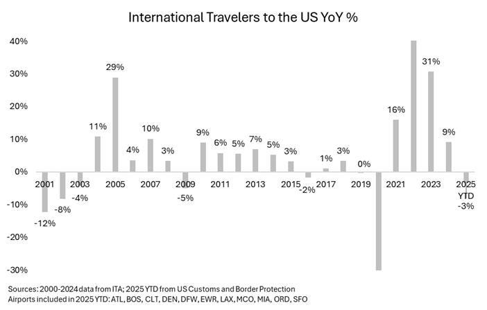 Year-to-date, international travelers to the US are down more than 3% year-over-year, which would be the first decline, excluding COVID-impacted 2020, since 2016 and the worst drop since 2009. 2021-2023 growth benefited from the post-Covid recovery, but international travel demand to the US typically grows unless there's a demand shock / recession (GFC, 9/11, dotcom bubble, Covid), which the current data does not support.